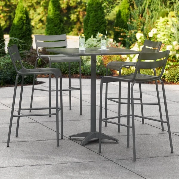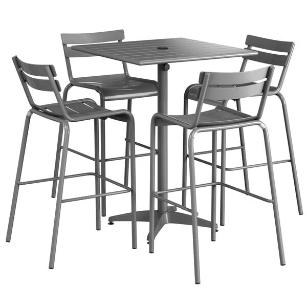 Lancaster Table & Seating 32″ X 32″ Matte Gray Powder-Coated Aluminum Bar Height Outdoor Table With Umbrella Hole And 4 Barstools