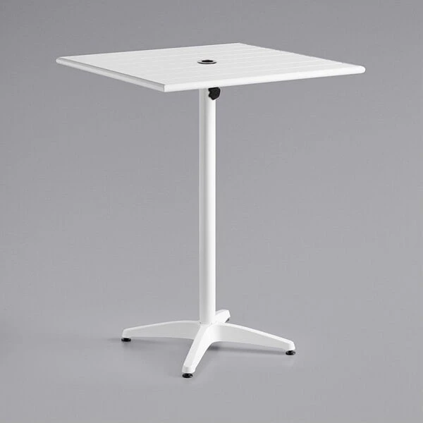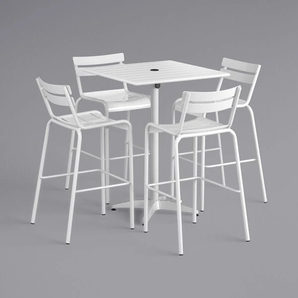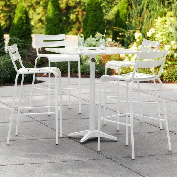 Lancaster Table & Seating 32″ X 32″ White Powder-Coated Aluminum Bar Height Outdoor Table With Umbrella Hole And 4 Barstools