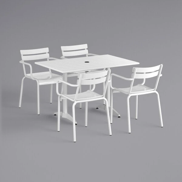 Lancaster Table & Seating 32″ X 48″ White Powder-Coated Aluminum Dining Height Outdoor Table With Umbrella Hole And 4 Arm Chairs