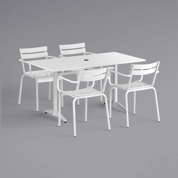 Lancaster Table & Seating 32″ X 60″ White Powder-Coated Aluminum Dining Height Outdoor Table With Umbrella Hole And 4 Arm Chairs