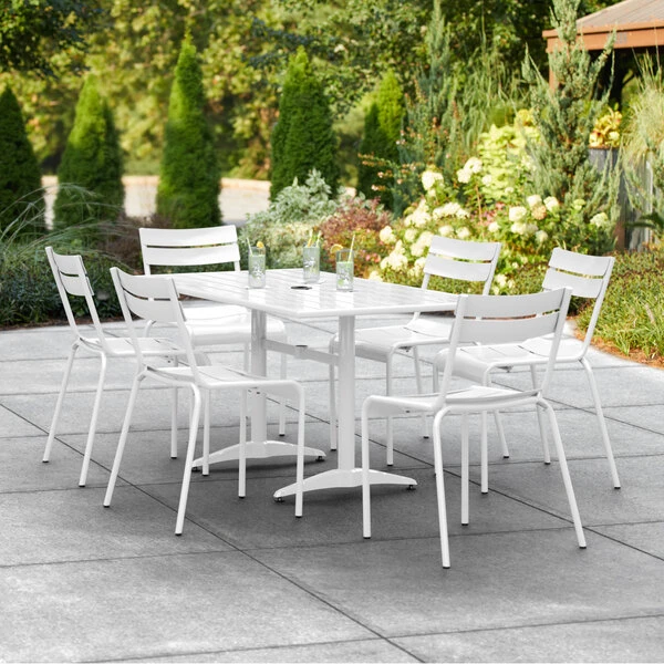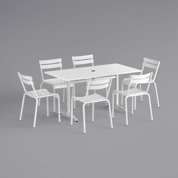 Lancaster Table & Seating 32″ X 60″ White Powder-Coated Aluminum Dining Height Outdoor Table With Umbrella Hole And 6 Side Chairs