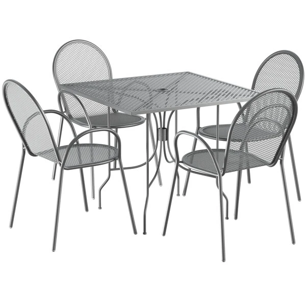 Lancaster Table & Seating Harbor Gray 36″ Square Outdoor Standard Height Table With Ornate Legs And 4 Arm Chairs